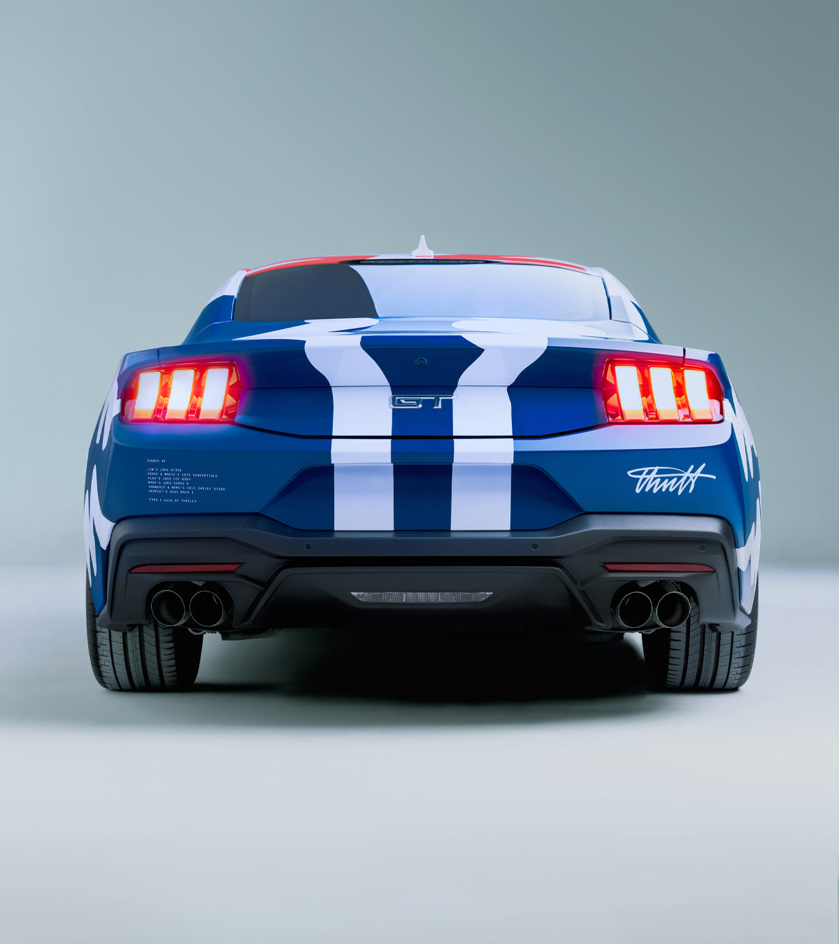From the audio, graphic signatures were created so the previous generations could "sign" the new model to celebrate the last of the V8 Mustangs.